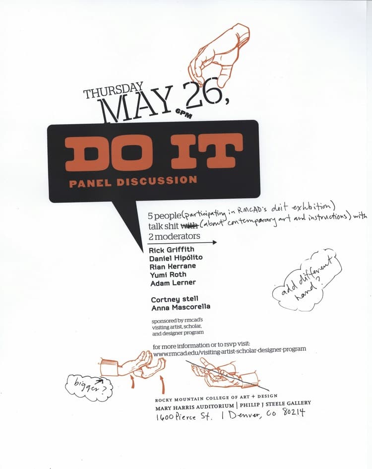 Originated by Swiss curator Hans Ulrich Obrist in the 1990s, do it is an exhibition model that centers on the notion of interpretation. Starting with a manual of text-based, do-it-yourself instructions written by internationally renowned artists, the exhibition requires other artists to reinterpret and re-imagine the instructions from their own perspectives. Five of the participants in the exhibition sat for a panel discussion which emphasized the rich theoretical underpinnings of the exhibition, including such themes as interpretation and intention, repetition and difference, language and meaning, and the global vs. the local.