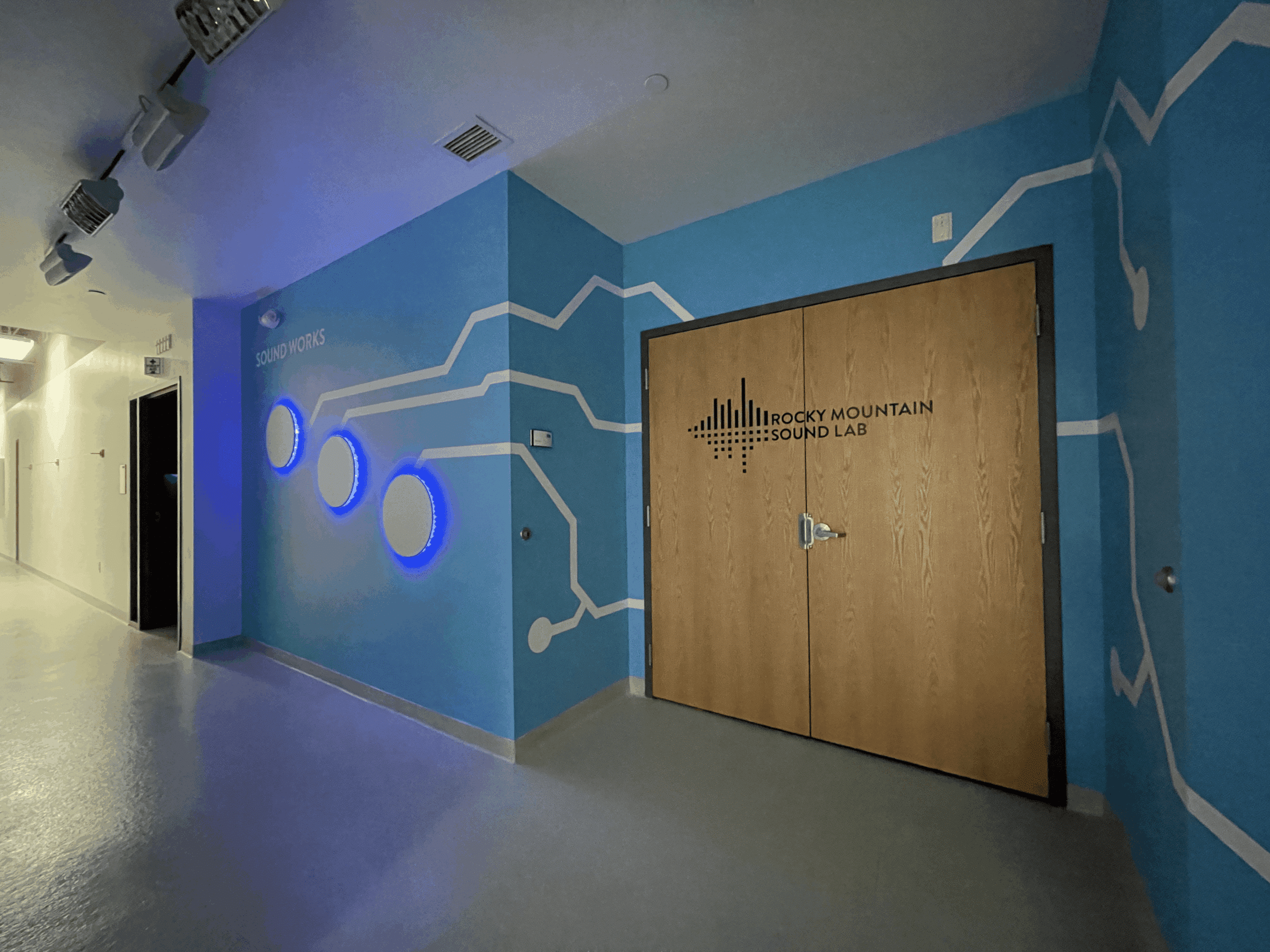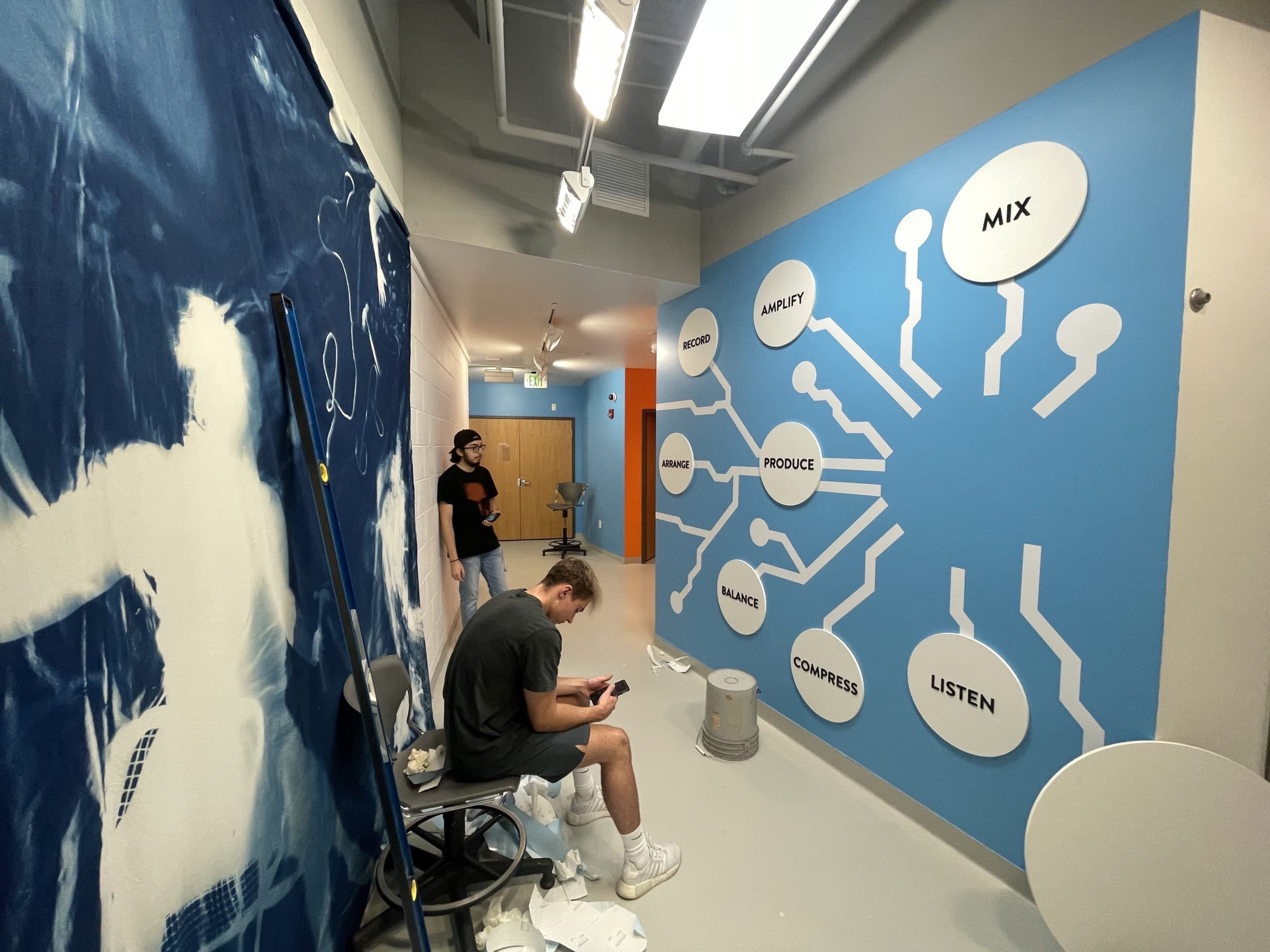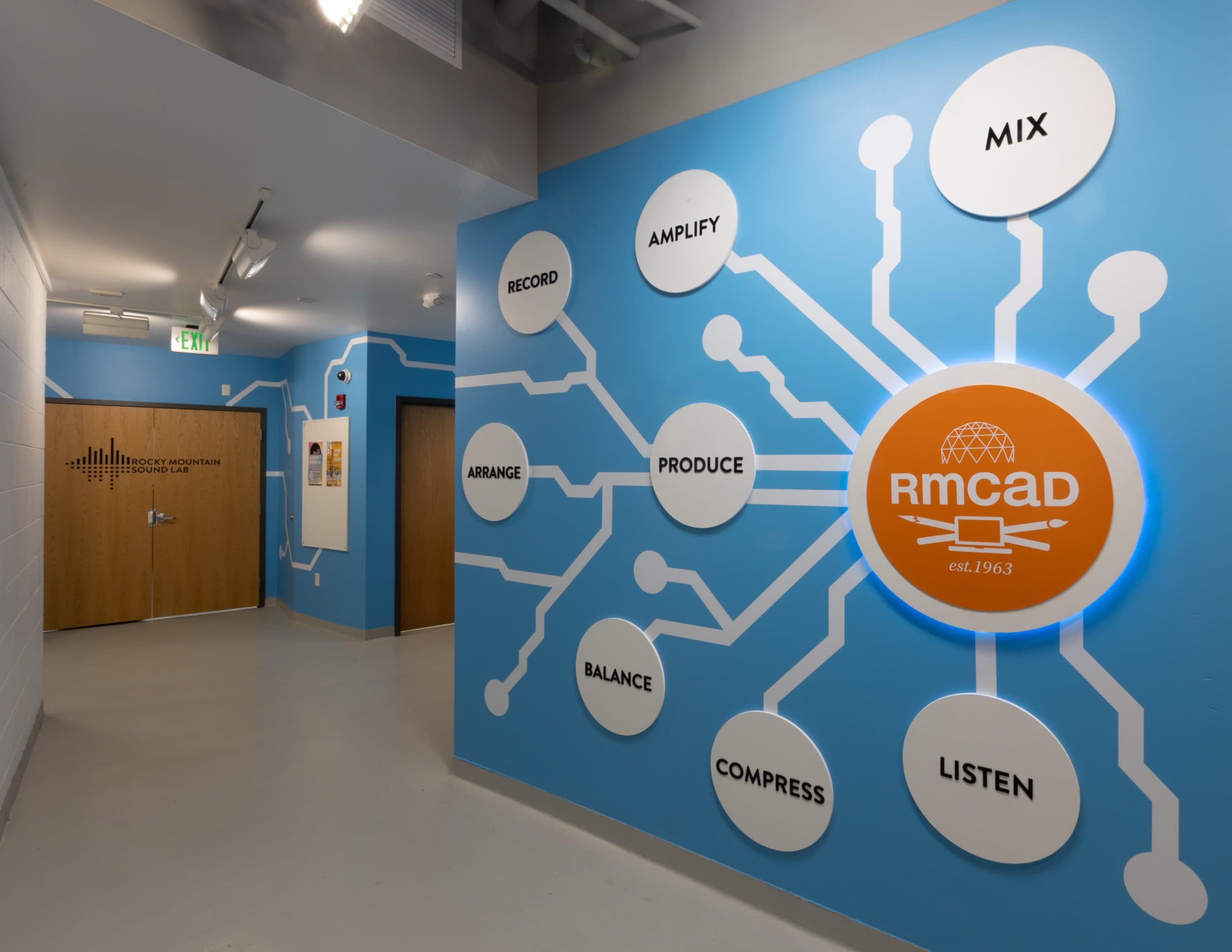 With brand identity solidified, it was time to start sketching the layout and new design concepts for the spaces. The newly named Rocky Mountain Sound Lab landed on a final design that incorporated a circuit board design with a listening section for students to hear recent work from the music program. “I hope students will notice that they also have a chance to create something for the school if they feel like something is missing or if there’s an area that could use an update,” says Oscar Ambriz, Team One student.